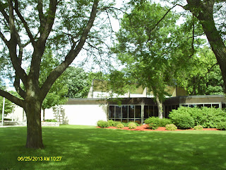 I talked to a very enthusiastic librarian who wanted to be sure that I realized I was in a Carnegie library--and I hadn't known that, although the older part of the building gives all sorts of hints, at least one of them not at all subtle--see second picture below. It's the Carnegie part of the building that is celebrating a centennial this year. The design was done, or at least influenced, by Frank Lloyd Wright; my notes are sketchy, perhaps someone reading this will clarify in a comment...please?