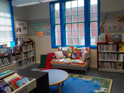 The dominant theme in the children's area is COLOR. This picture is taken from the teen area. The sets of blue shelves are J fiction and non-fiction.
