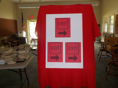 I decided to start taking interior pictures at the "back" of the library, in a multi-purpose room. Yes, the exit is here. The library is following good practices and planning one-way traffic. It's clear that this is where you leave, but we won't just yet. [I didn't get a picture but hand sanitizer was available inside the door, on a table and in a wall dispenser.]