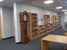 From another angle, you can see the handsome grandfather clock. Many families have found that the public library is just the place for a precious family heirloom like this that no longer fits into their home.