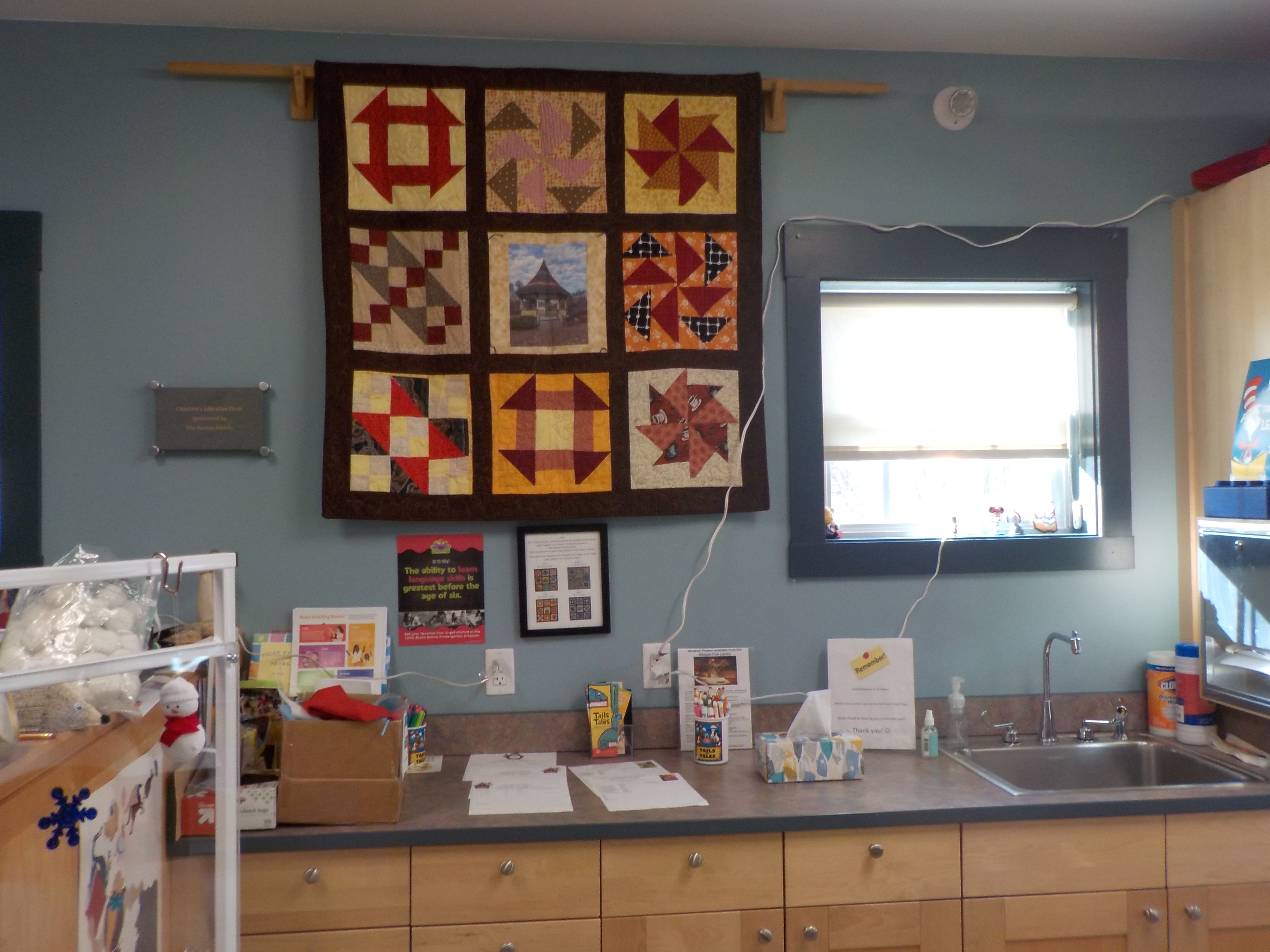 The biggest quilt in the community Room is commemorating the 250th anniversary of New Boston and is protected by safety glass. The others quilts in that same area were donated by a local teacher who did them with her Kindergarten classes over the years.