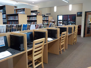 It's not unique but it is a bit unusual to find open space like this in smaller libraries. For some reason it gives me a sense of possibilities. The yellow sign on the floor is a reminder about social distancing.
